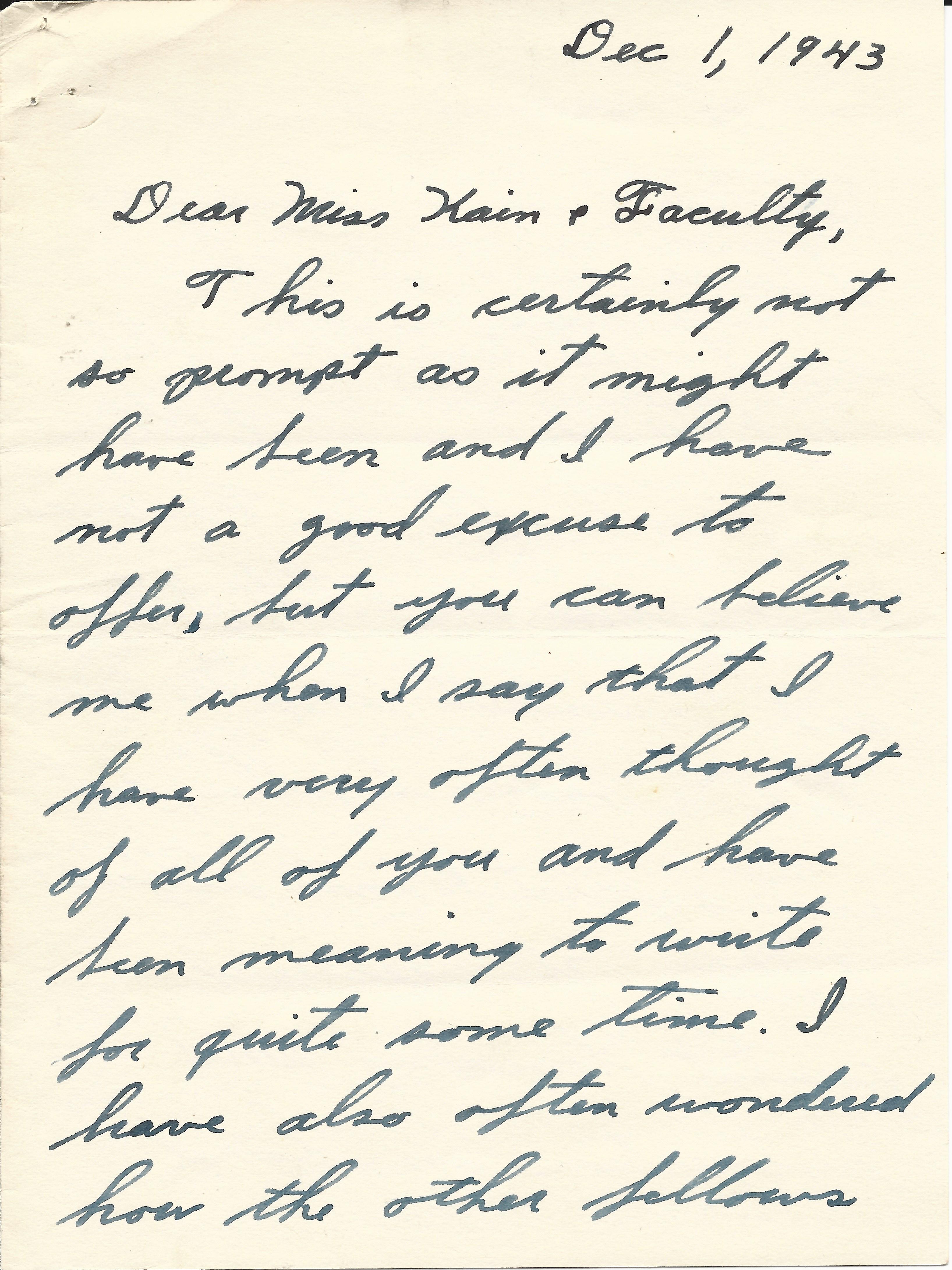 This is certainly not so prompt as it might have been and I have not a good excuse to offer, but you can believe me that when I say that I have very often thought of all of you and have been meaning to write for quite some time. I have also often wondered how the other fellows were making out who came in with me from school and was much pleased and delighted this morning when the Service Mens News arrived in the mail. It has cleared up many of the questions that were in my mind. It is splendid of you to keep the men in the service informed by such means.